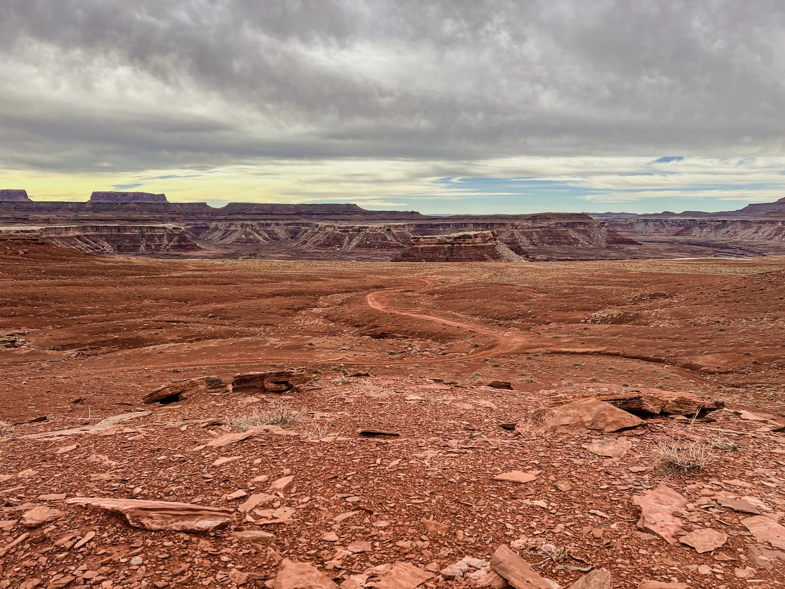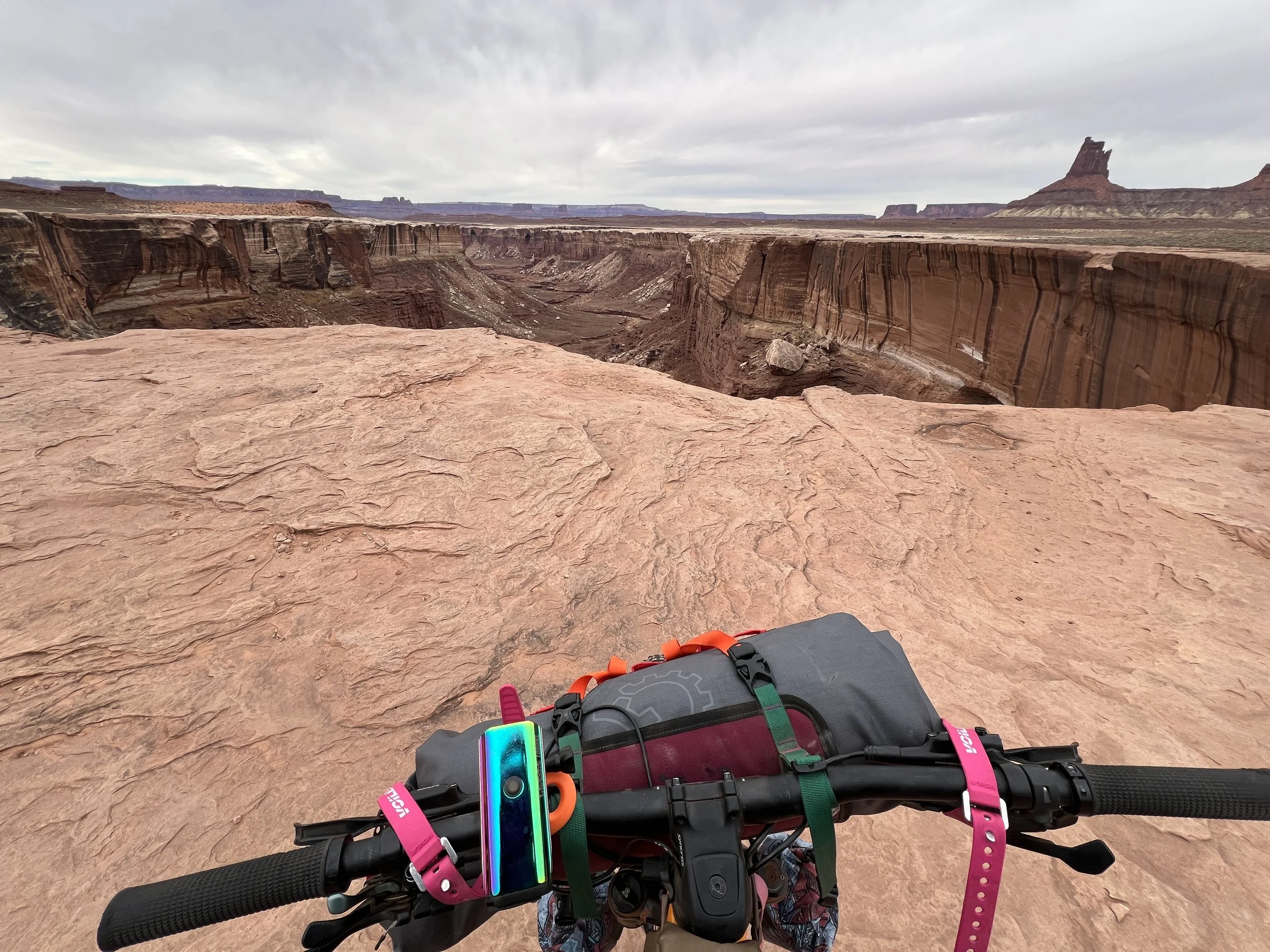 “I kept looking for you when I got to camp,” J said, pointing to the thin line of the White Rim trail miles and miles away, far below. “I was so worried I was going to see a bike light turn on wayyyyy out there and have to ride out for a rescue. I must have missed you when I was setting up the tent.”
