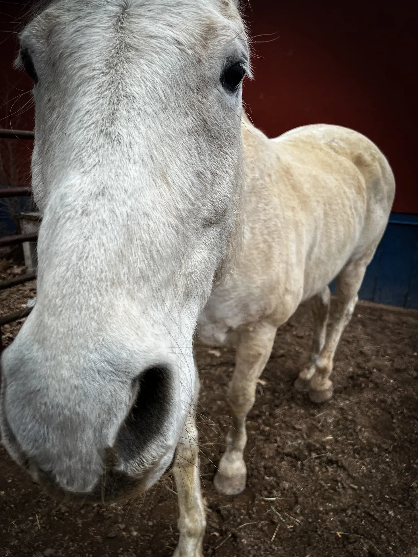 “Any special markings or brands to identify him?” he asked. CW shook his head. Even from a distance, I could see a splatter of brown freckles in his white coat, which apparently weren’t special enough (and which I later learned dubbed him the unfortunate descriptor of “flea-bitten gray”). The inspector scratched a note onto the clipboard and walked back to the truck.